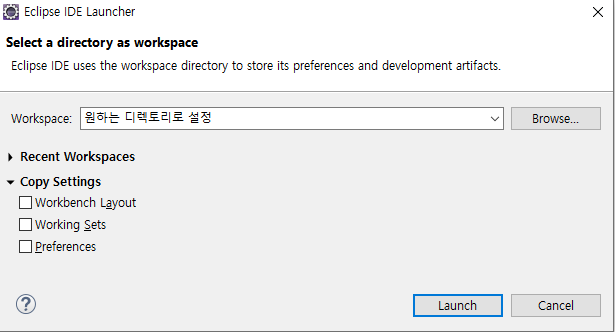 Launch를 클릭하면, Eclipse가 Reload되면서 워크스페이스가 변경됩니다.