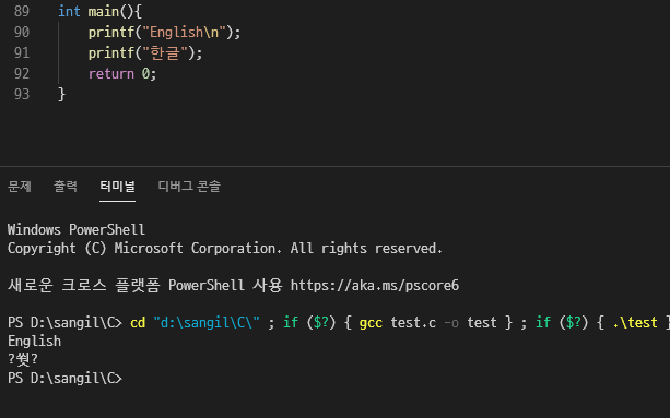 - 저장( Ctrl + S ) 후 사용 중이던 터미널을 잠시 끄고, 다시 c파일을 컴파일해보면 다음와 같이 제대로 동작함을 알 수 있다. 적어놓고 보니 이 방법이 더 간단해보이기도...