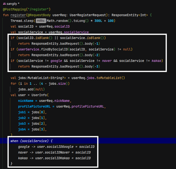 로직 설계 계획이 모두 끝나고 작성하는 도중에서야 코드 추천이 생성되던(그마저도 엉뚱한 코드, 에러 코드를 자주 내뱉던) Flutter에서와는 달리, 적당한 위치에 커서만 위치해놓으면 Copilot이 알아서 '아, 여긴 request에 대한 예외 처리가 들어갈 자리구나. 이런 예외처리는 어때?' 라고 말하듯 거의 정확한 코드를 추천해줍니다.