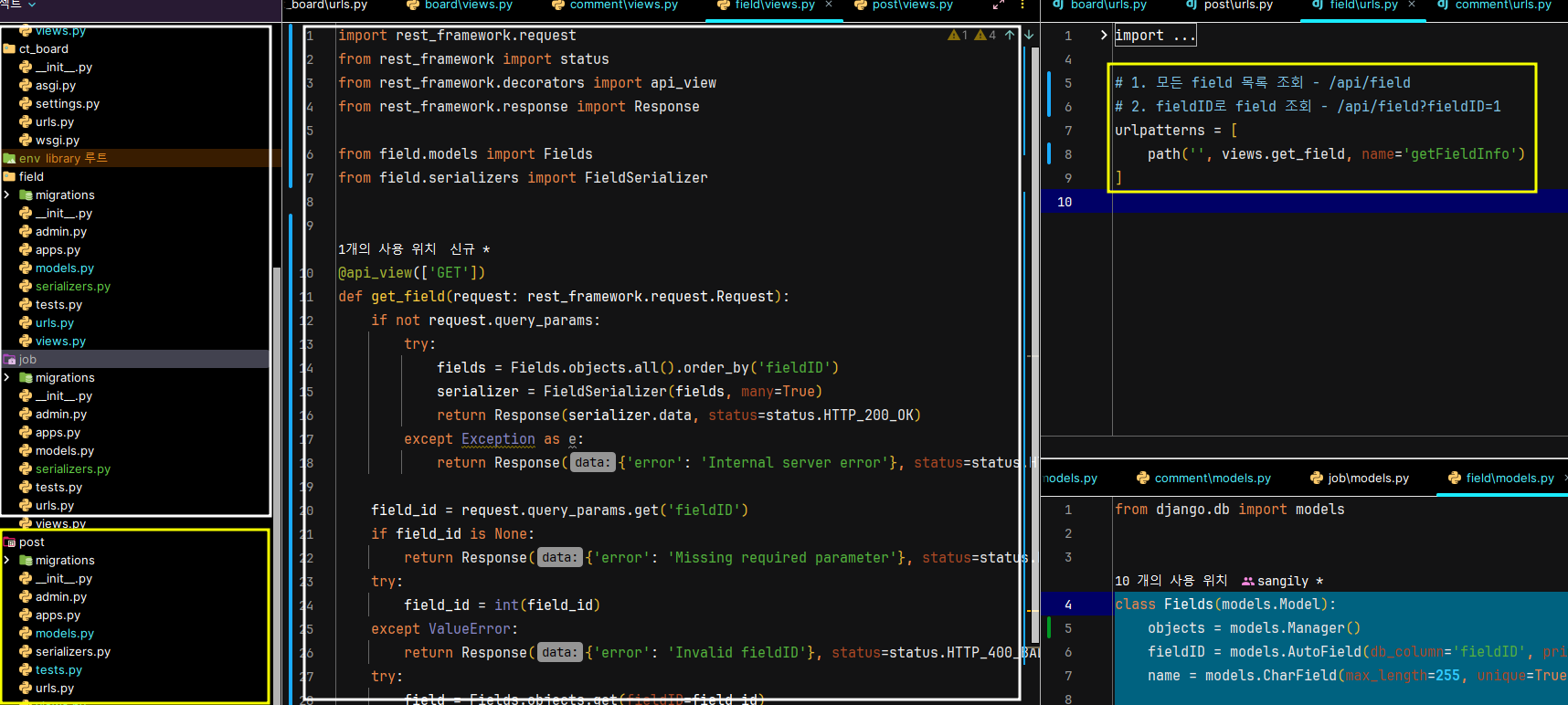 Django Project Copilot 위 스크린샷에서, 노란색 박스가 직접 작성한 코드, 흰색 박스가 제 기존 코드 스타일에 맞춰서 Copilot이 자동으로 작성해준 코드들입니다.